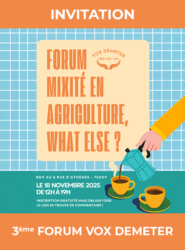 Lors du premier Forum VoxDemeter en 2023, nous avions questionné le monde agricole sur son ambition à s’ouvrir à plus de mixité. En 2024, nous avons mis au centre de cet effort les indispensables interactions collaboratives. Un an après la sortie de la Note Agridées-VoxDemeter « Entrepreneuriat féminin en agriculture : libérer les potentiels ! » nous vous invitons à mobiliser nos énergies communes pour appréhender les différentes solutions pour soutenir la transformation de l’agriculture » dans ses dimensions économiques, environnementales et sociétales. Programme : - Accueil à partir de 11h30